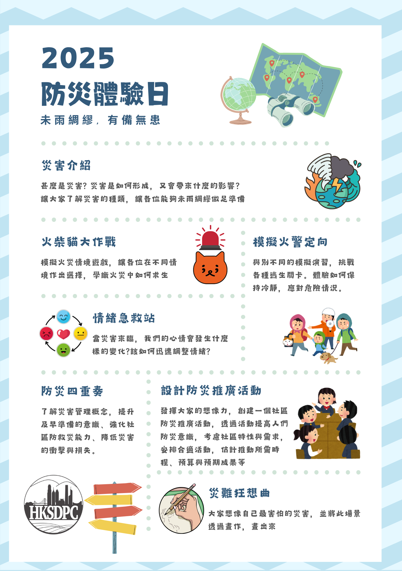 設計防災體驗日,為機構引入切身的防災體驗,讓參加者更實在的感受災害環境和求生體驗,學習在緊急情況下的應急。