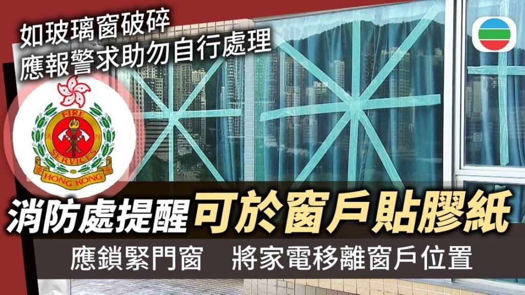 無綫新聞 ︳風暴樺加沙 —— 消防處提醒將門窗鎖緊遠離當風窗戶 可於窗戶貼上膠紙