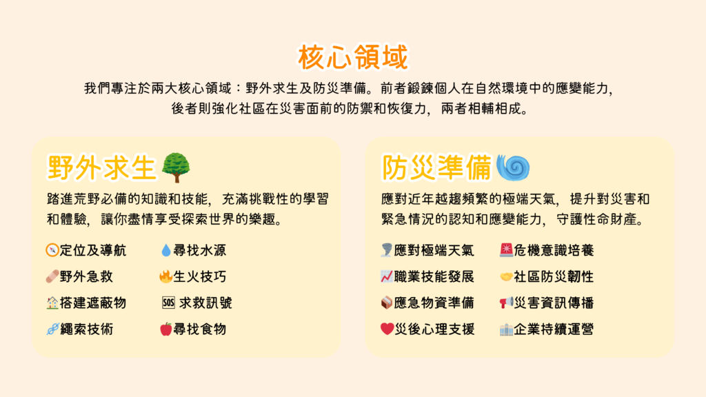 香港求生及防災協會(HKSDPCL)深信,現代社會的「脆弱日常」極需被正視,唯有培養危機意識與生存技能,才能讓下一代在變局中穩步前行。成立於2021年,本會以「未雨綢繆,有備無患」為核心精神,致力填補都市化進程中被遺忘的生存教育缺口。我們觀察到,香港雖是高度發達城市,但市民對災害的認知卻十分稀缺,缺乏超前準備和應變能力。從極端氣候到公共衛生危機,唯有將防災意識轉化為日常行動,方能共同建立具禦災力的社區。